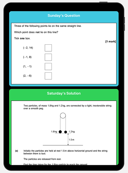 Daily A-Level Mathematics questions keep you on track to achieving the best grade possible. A new question will appear daily with a worked solution to yesterday's question. This app allows you to stay consistent with your revision and allows the user to focus on answering questions rather than finding them.